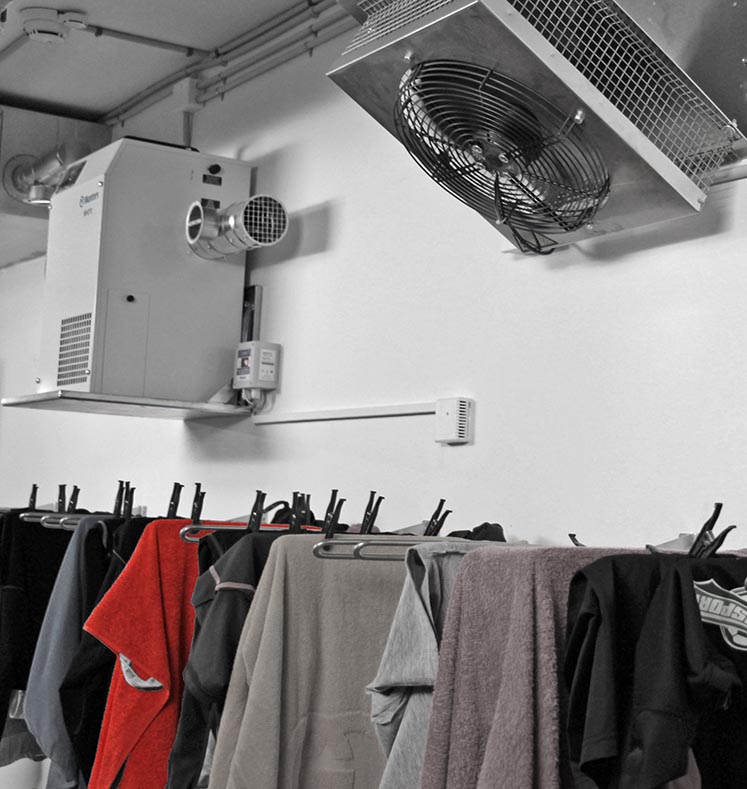 早上第一位使用的員工啟動(dòng)干衣間三個(gè)循環(huán)風(fēng)機(jī)開關(guān)后,掛上衣服、鞋子和毛巾。這不僅可確保衣服中的水分被排放到室外空氣中,同時(shí)工業(yè)除濕機(jī)提供的干燥空氣可有效均勻地分布在整個(gè)房間中。當(dāng)室內(nèi)的相對濕度高于45%時(shí),工業(yè)除濕機(jī)自動(dòng)會(huì)開始工業(yè)除濕。