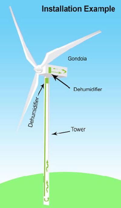 Secondly, in the turbine machinery nacelle, the whole machinery component area is dehumidified and protected against condensation and corrosion, from production phase to installed on site.