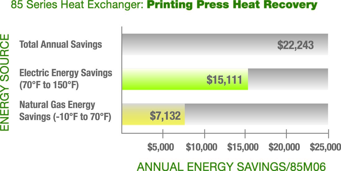 熱能節(jié)約的主要原因在于印刷廠的電熱器無需頻繁地操作。在一個(gè)特別的冬日里,熱回收系統(tǒng)將外部空氣從32℉加溫至98℉,并直接將預(yù)先準(zhǔn)備好的空氣供應(yīng)至印刷機(jī)。大部分外部空氣的加熱需要成本極高的電力。
