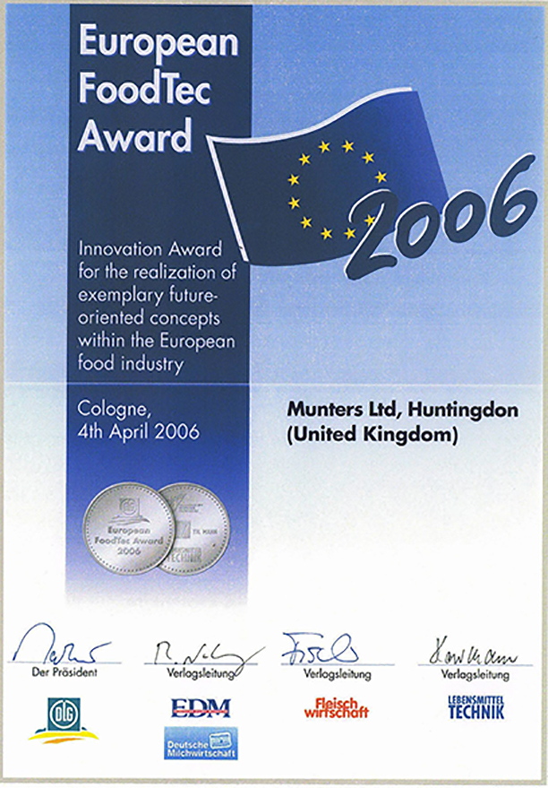 2006年歐洲食品技術(shù)銀獎(jiǎng)于阿努加食品博覽會(huì)上進(jìn)行頒發(fā),獎(jiǎng)項(xiàng)頒發(fā)給為顯著改進(jìn)加工功能而開發(fā)的產(chǎn)品。該獎(jiǎng)項(xiàng)的國際評審委員會(huì)由歐洲食品加工、肉類、乳制品和食品科學(xué)研究所的代表組成。