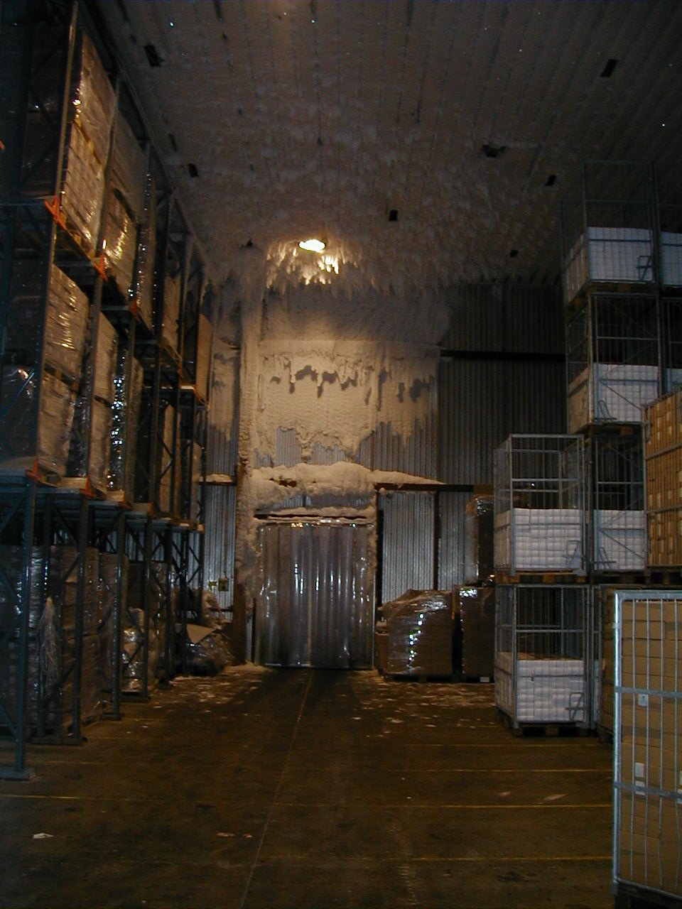 現(xiàn)在,進(jìn)入冷藏倉(cāng)庫(kù)的空氣經(jīng)過(guò)工業(yè)除濕,只含少量水分,因而大幅減少了凝結(jié)在蒸發(fā)器和門(mén)上冰阱等地方的冰霜。